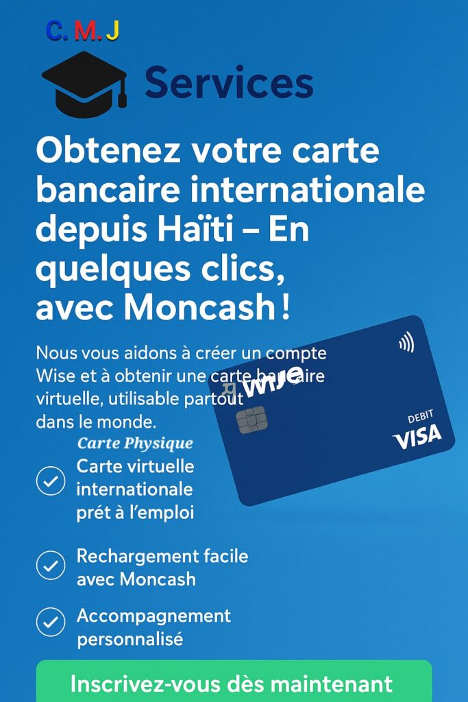 ✅ TAccédez à une carte Wise physique et virtuelle et utilisables en ligne partout dans le monde.✅ Alimentez votre carte depuis votre pièce d’identité à l’aide de MonCash ou Natcash (nous vous guidons).